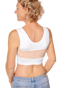 De Anatomische Compressieband houdt de geopereerde borst op zijn plaats en voorkomt ongewenste beweging van eventuele implantaten. Dankzij het anatomische ontwerp, dat speciaal is gevormd voor een nauwsluitende pasvorm onder de arm, wordt effectieve compressie geboden zonder ongemak of huidirritatie. De huidvriendelijke materialen en het aanpasbare sluitsysteem bevorderen het genezingsproces en ondersteunen de lymfedrainage. De band kan apart worden gedragen of bevestigd aan compatibele compressiebeha’s voor extra stabiliteit.