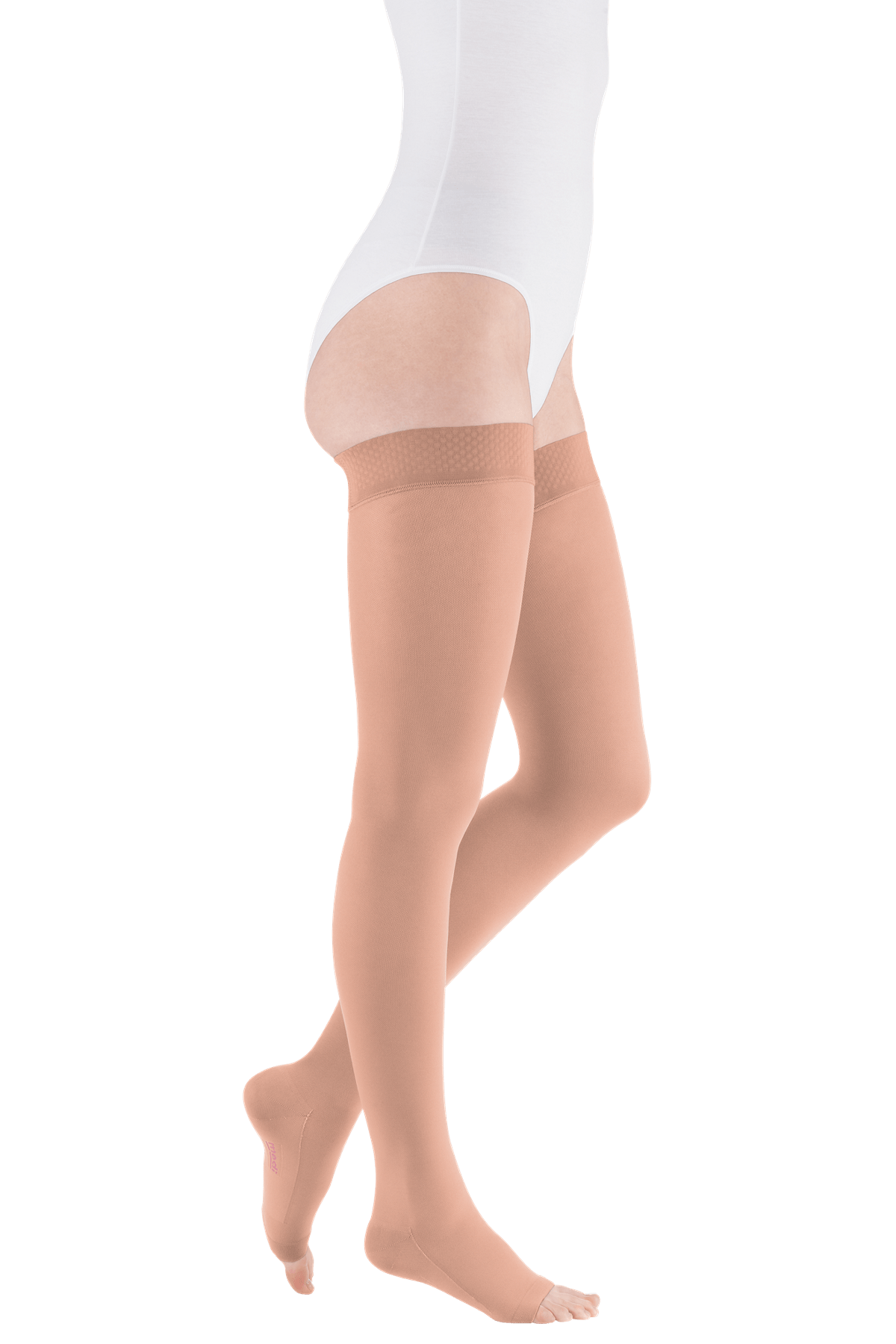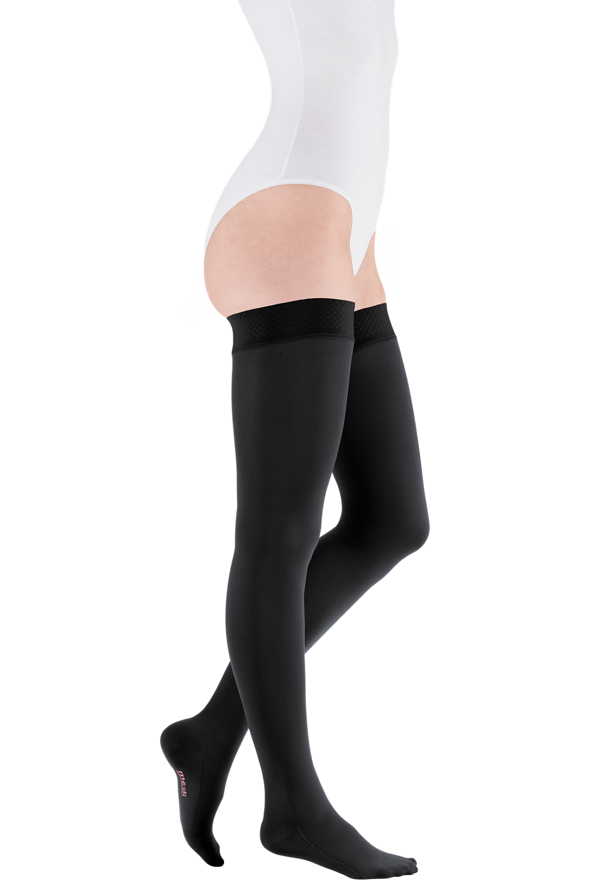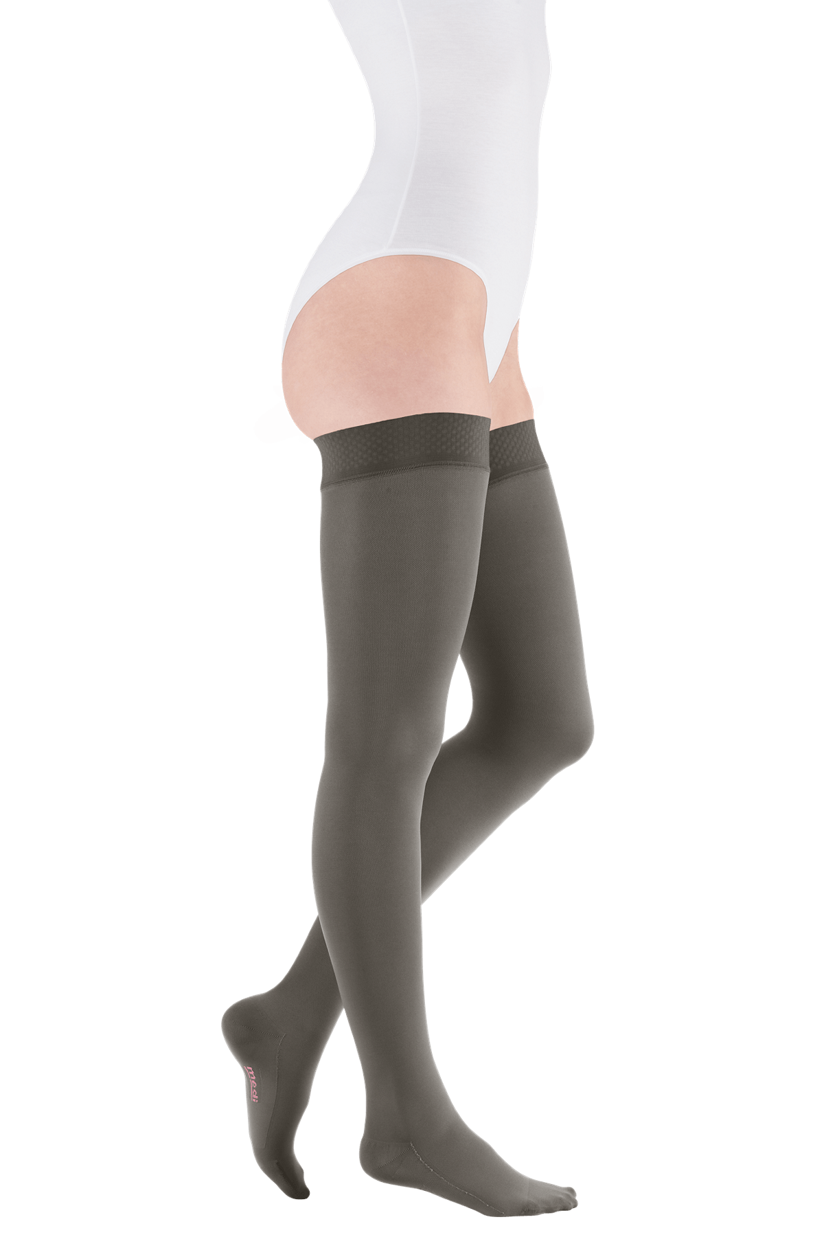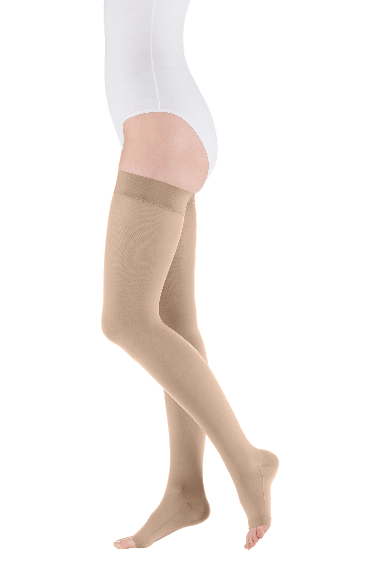 De Mediven® Comfort is gemaakt van een uitzonderlijk zacht, rondgebreid materiaal dat het aan- en uittrekken vergemakkelijkt. De fijne breitechniek zorgt voor een hoog loop- en draagcomfort. De dijboord sluit soepel aan zonder te knellen, en is afhankelijk van de uitvoering verkrijgbaar met tricotboord of smalle siliconen topband. Het materiaal is ademend, huidvriendelijk en gecertificeerd volgens de OEKO-TEX Standard 100.