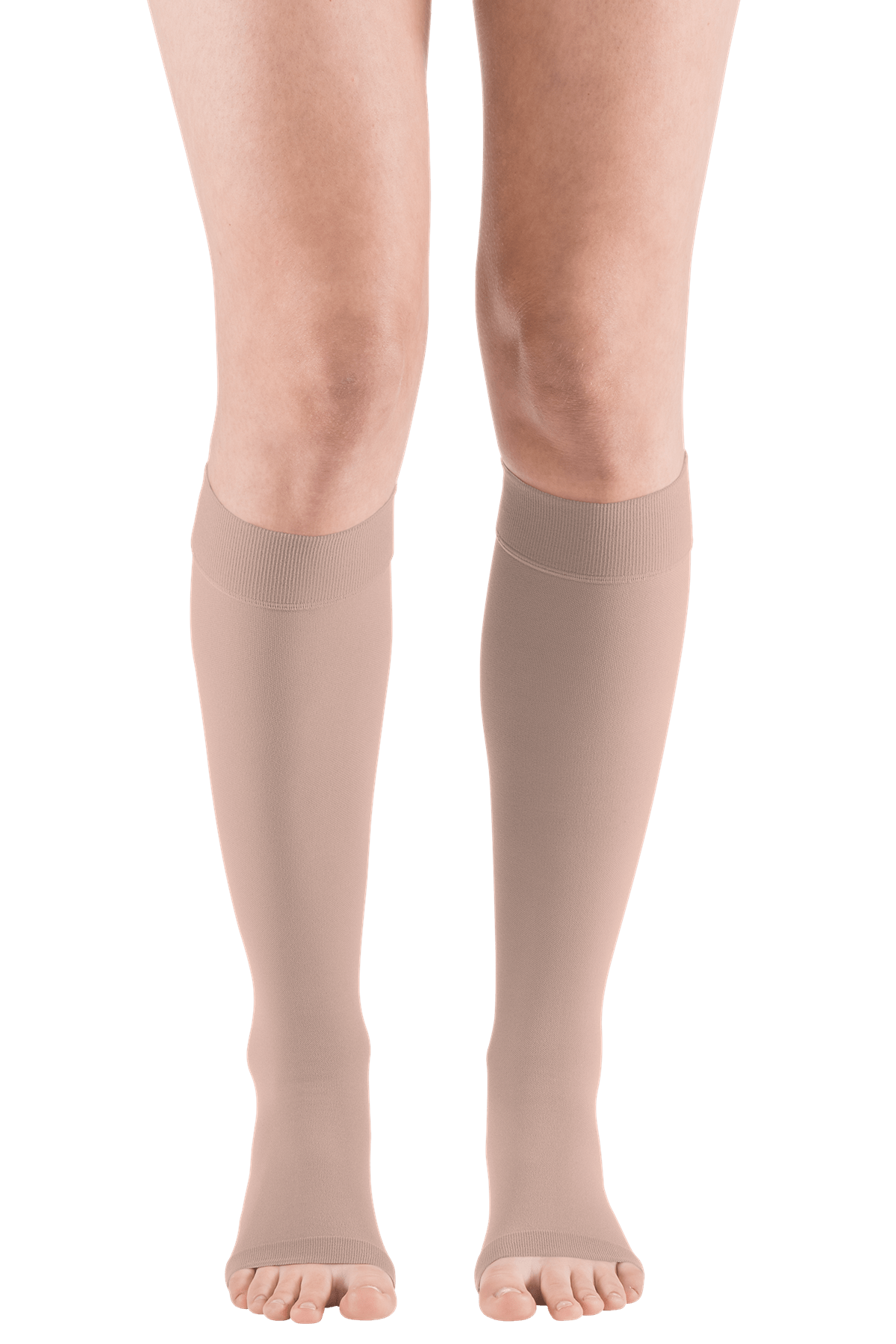 De Mediven® Plus AD kniekous is verkrijgbaar in diverse natuurlijke kleuren. De anatomische pasvorm sluit mooi aan rond enkel, voet en kuit en biedt een stevige, betrouwbare ondersteuning gedurende de hele dag. De zachte maar stabiele boord voorkomt afzakken zonder te knellen of afdrukken te veroorzaken.