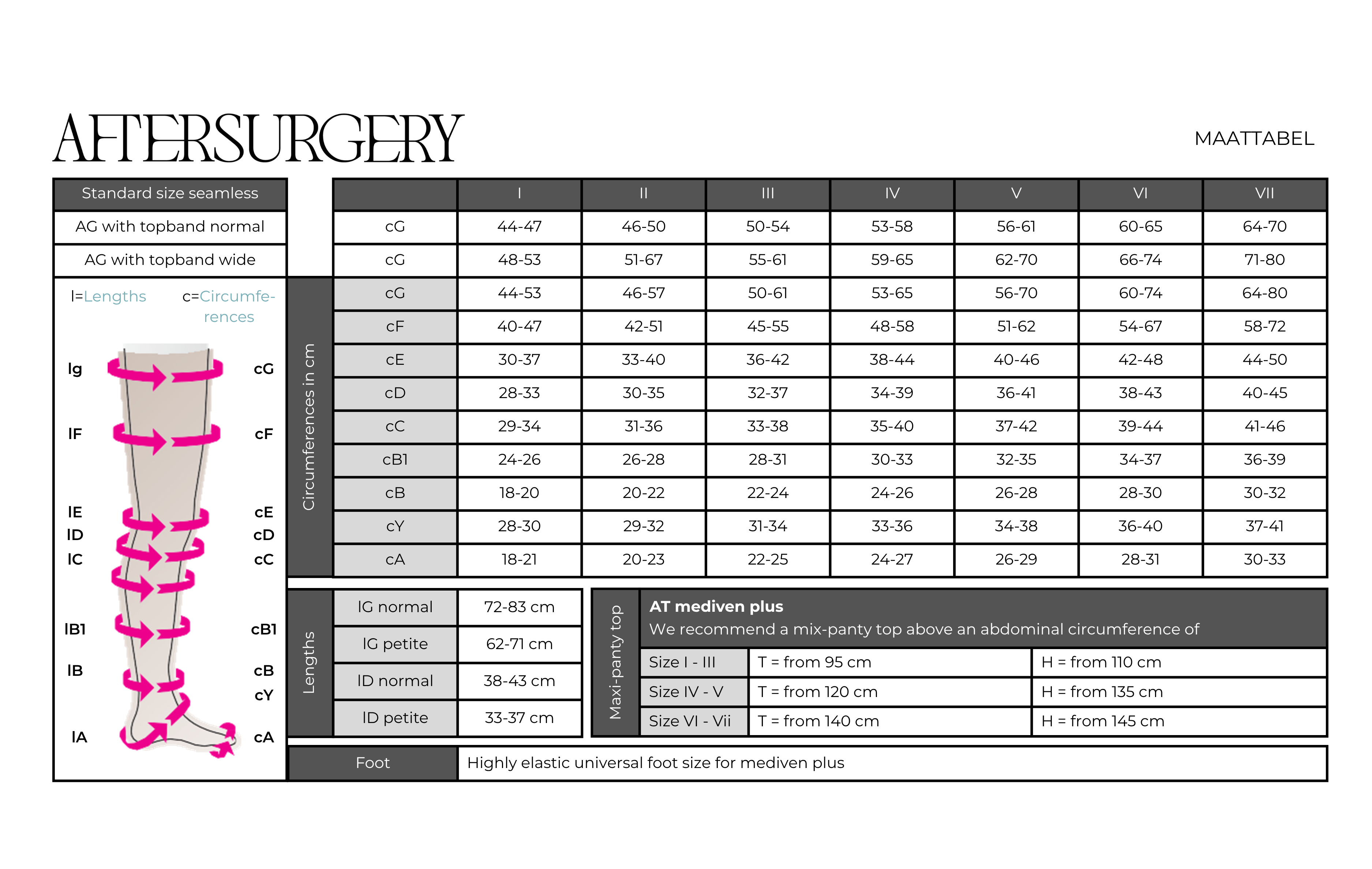 De Mediven® Plus AG dijbeenkous is verkrijgbaar in meerdere confectiematen. Raadpleeg altijd de maattabel om de juiste maat te bepalen, of laat uw benen professioneel opmeten voor een optimale pasvorm.