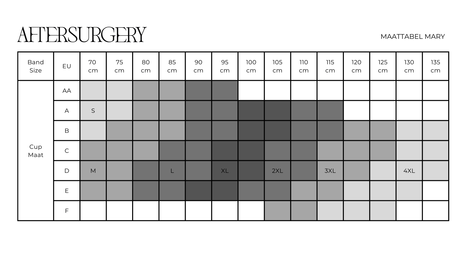 De Mary is verkrijgbaar in de maten S t/m XXXXL. In de maattabel kunt u aflezen welke maat het meest geschikt is voor uw omvang.