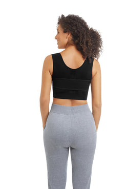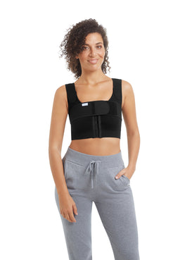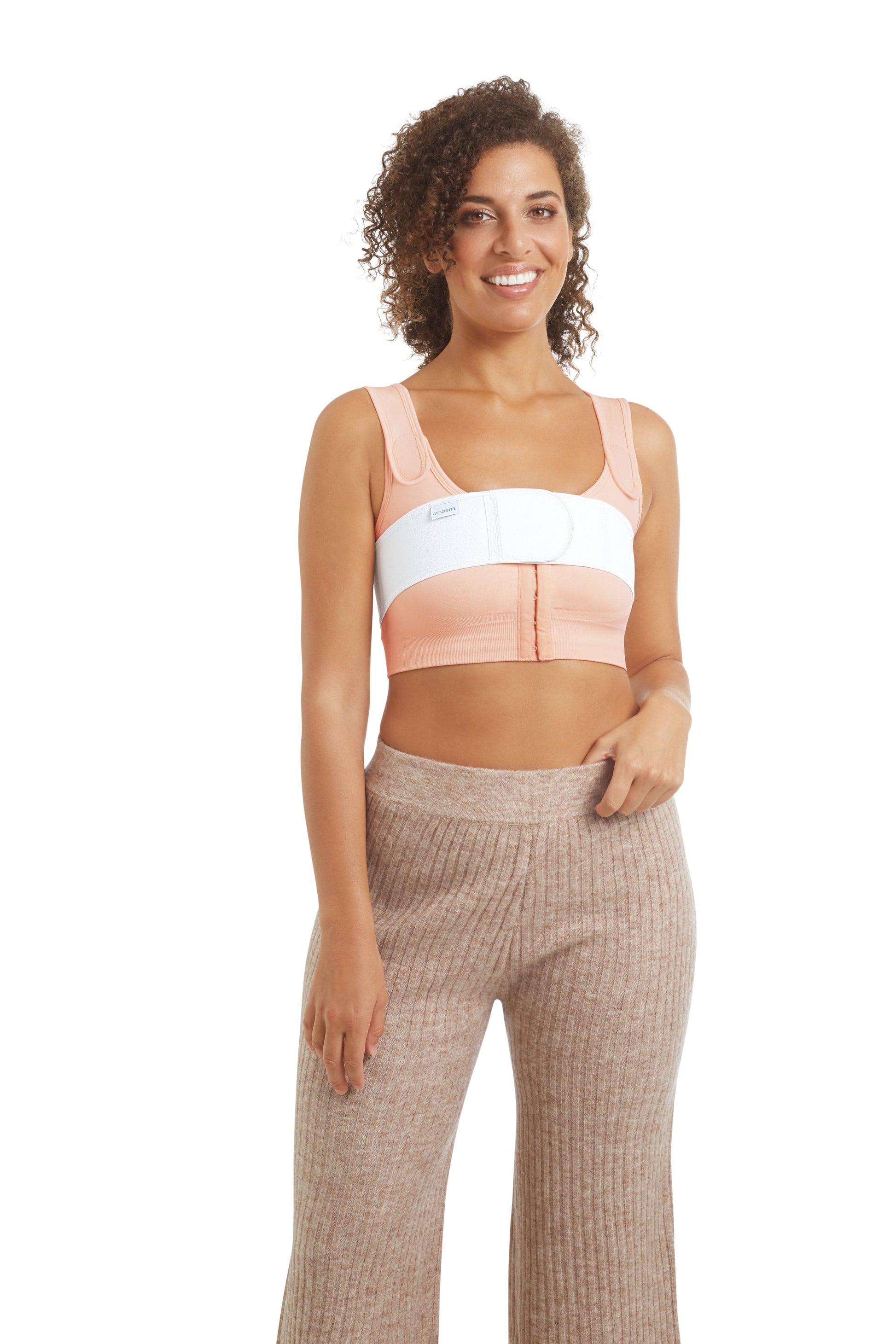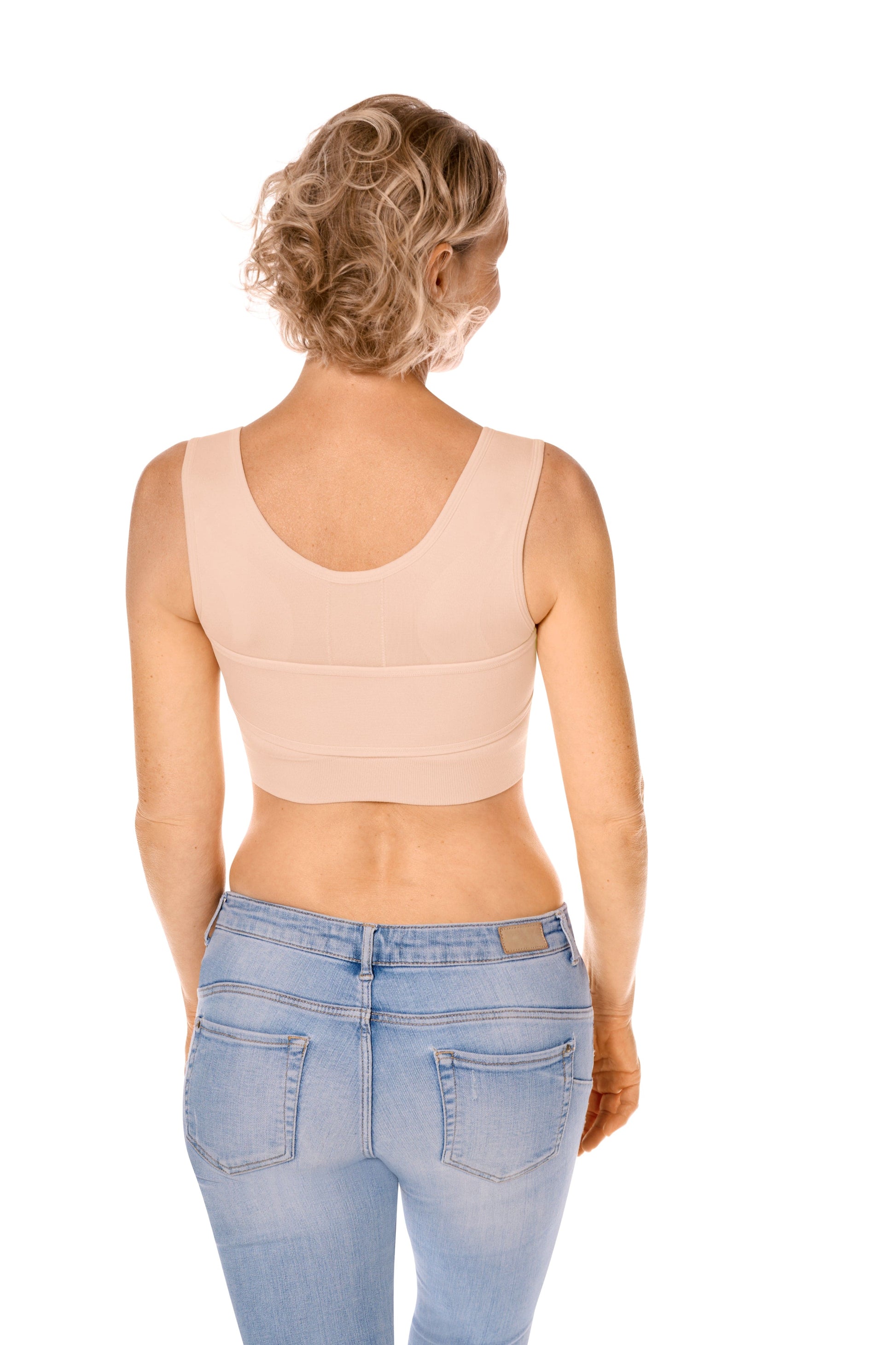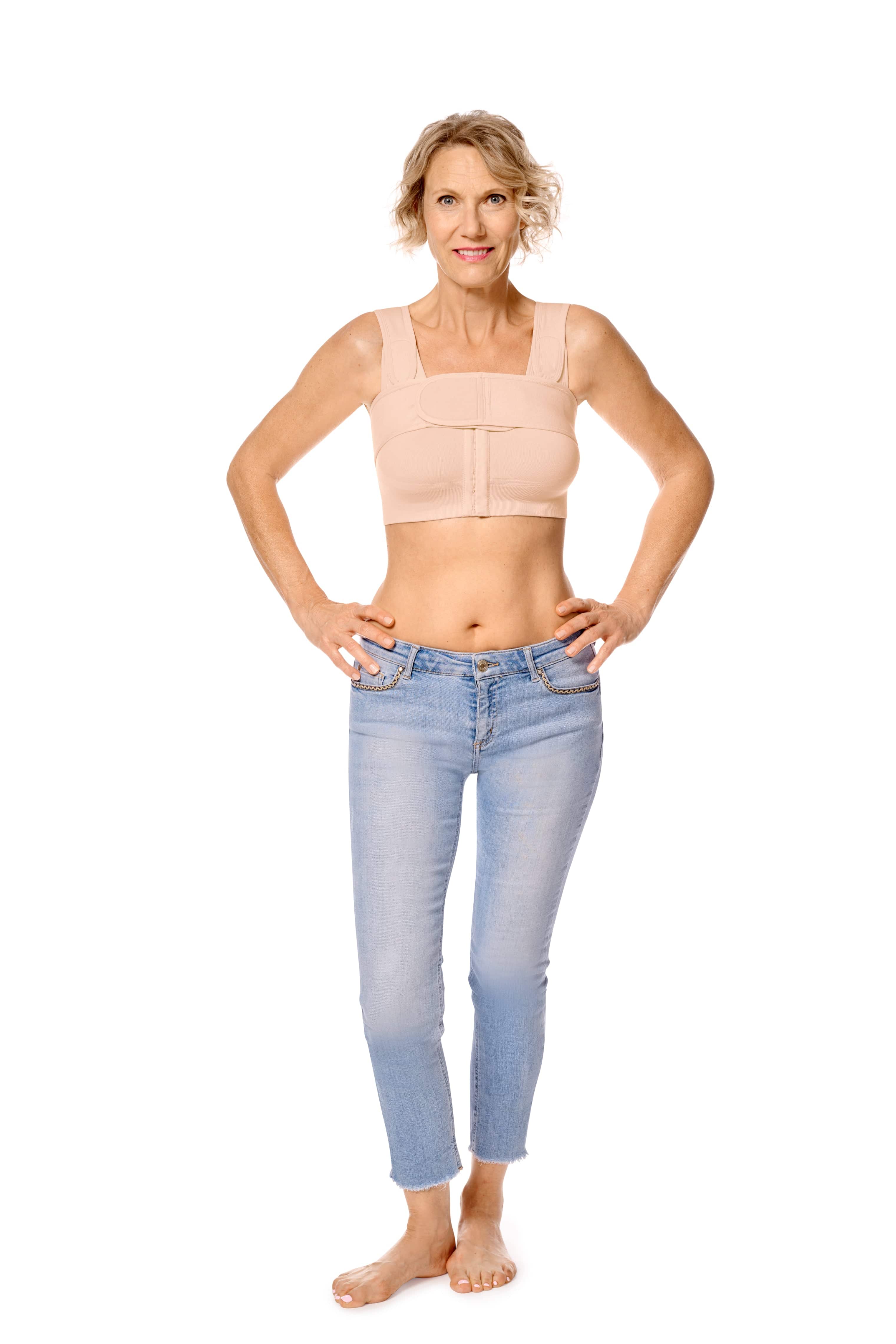 De compressieband is anatomisch gevormd en gemaakt van stevige, rekbare stof voor een individuele pasvorm met gerichte compressie op het bovenste deel van de borst. Het huidvriendelijke materiaal vermindert irritatie, en dankzij de verstelbare haak-en-oogsluiting aan de voorzijde is de compressie gemakkelijk aan te passen. De geïntegreerde flap midden op de rug is ontworpen om stevig te bevestigen aan de compressiebeha’s van Amoena, maar kan worden ingevouwen wanneer deze niet wordt gebruikt.