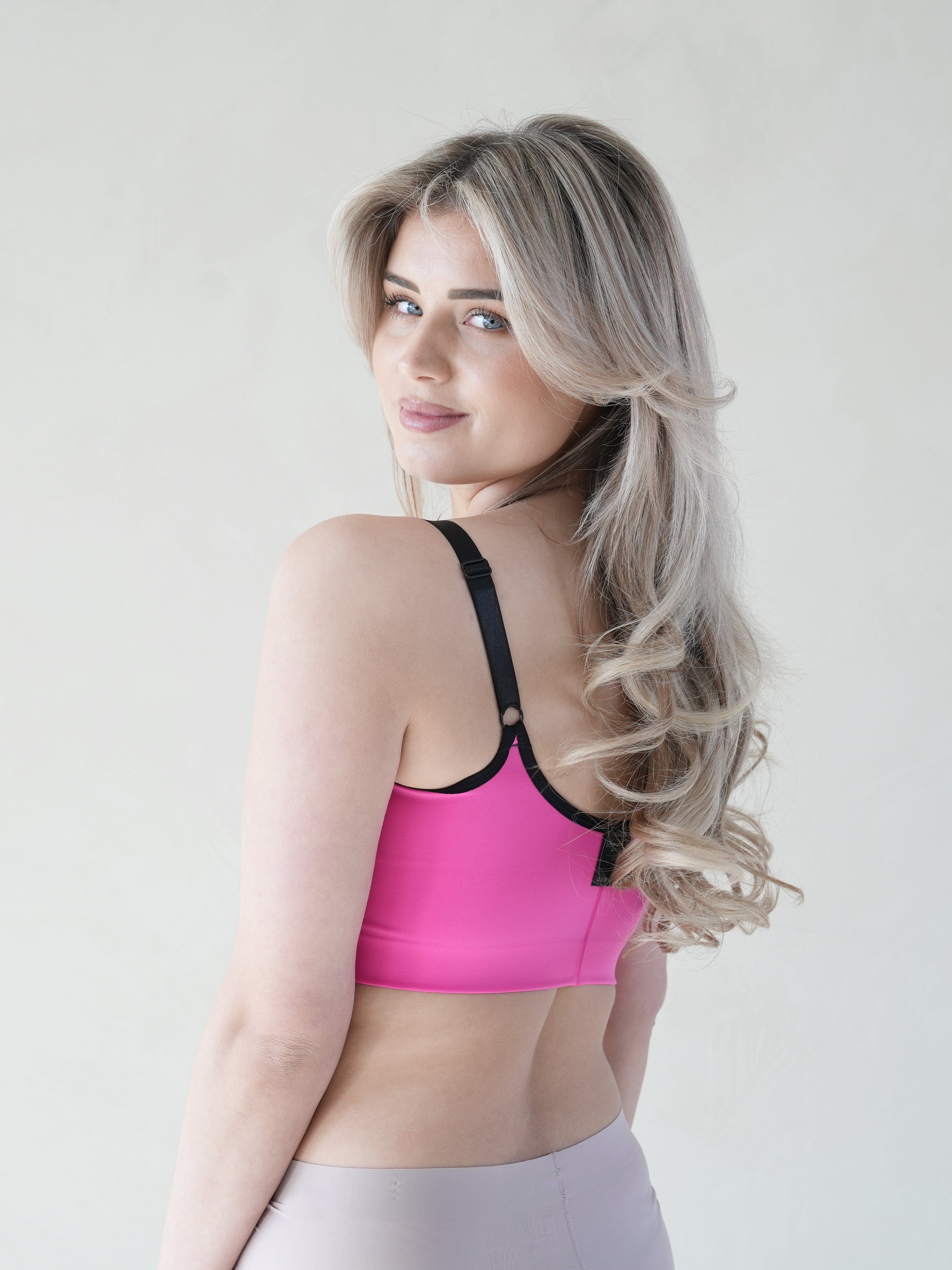 Het hogere uitsnijdingsontwerp zorgt voor een grotere dekking, waardoor comfort en ondersteuning worden gemaximaliseerd. De naadloze cups zijn met hitte voorgevormd voor maximaal comfort. Verkrijgbaar in zwart en roze.