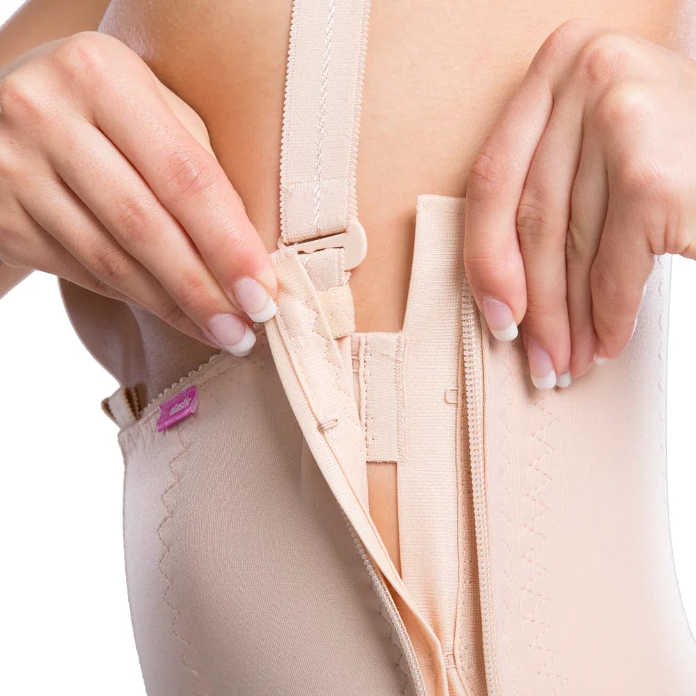 Het compressiekledingstuk komt tot net onder de borst en heeft een smalle zoom met riempjes waaraan u de afneembare en verstelbare schouderbandjes kunt bevestigen. De pijpen komen tot net boven de knieën. Verkrijgbaar in zwart en beige.