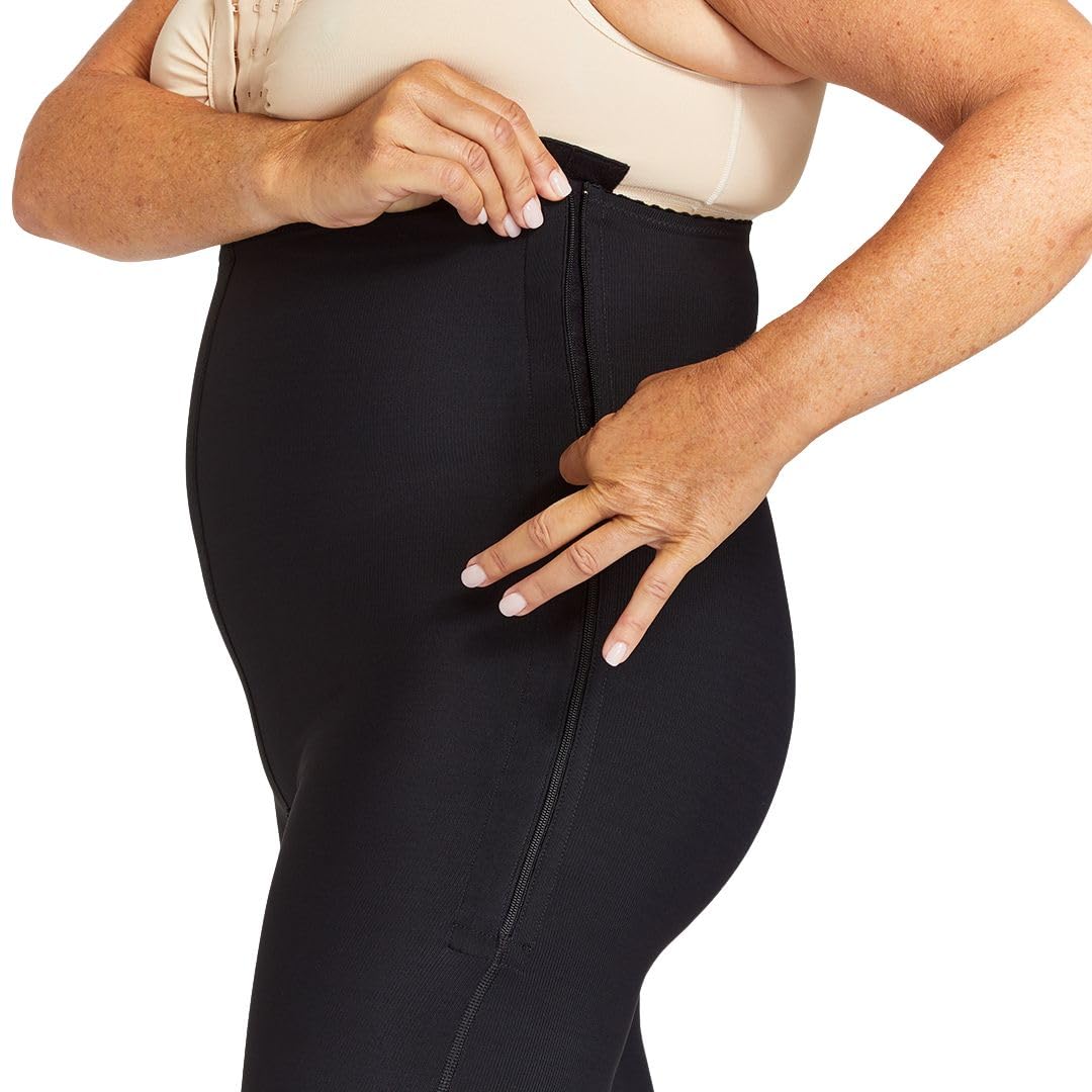 De compressielegging heeft ritssluitingen aan de zijkant en gevoerde haak- en oogsluitingen, wat het aan- en uittrekken vergemakkelijkt.