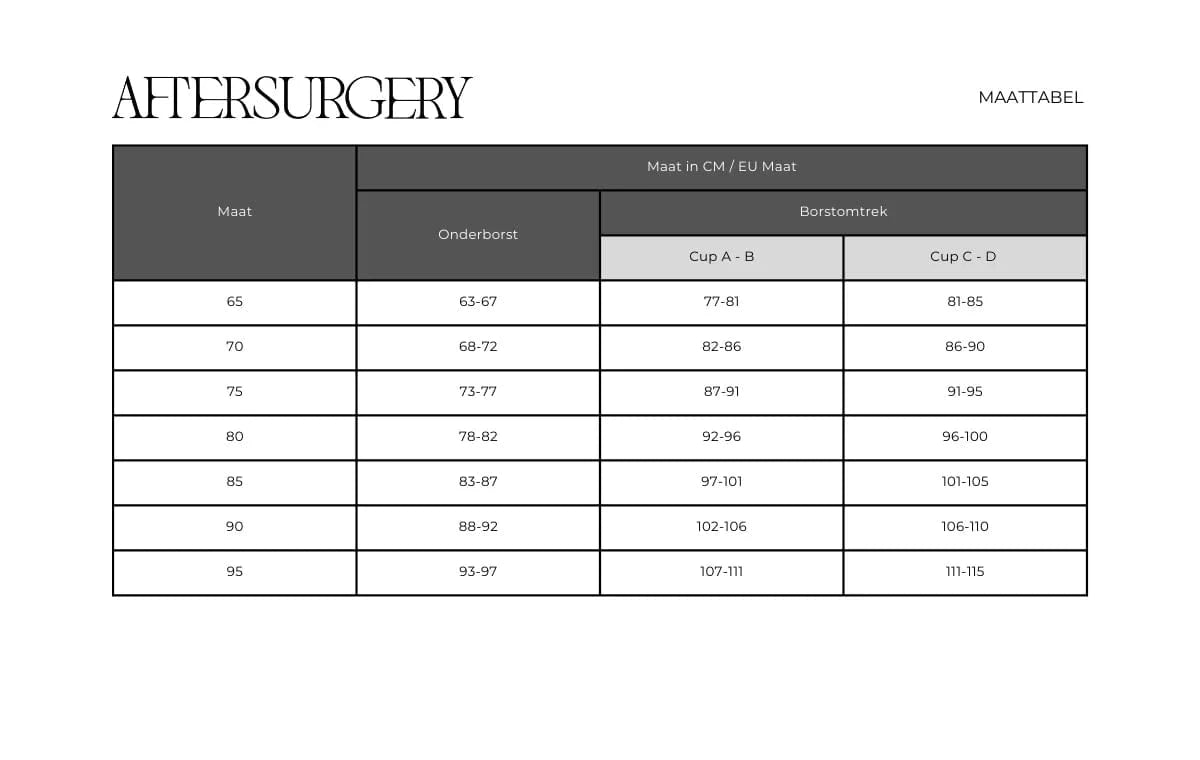 De PI premium is verkrijgbaar in de maten 65AB t/m 95CD. In de maattabel kunt u aflezen welke maat het meest geschikt is voor uw omvang.