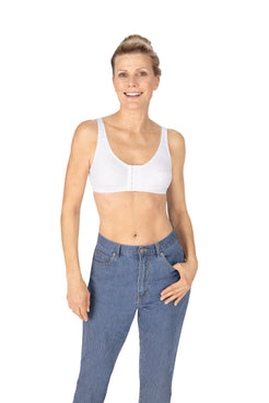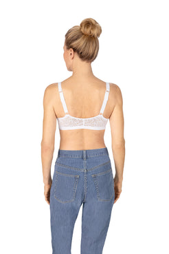 De Sandra beha is gemaakt van huidvriendelijke katoen en heeft aan de binnenzijde katoenen hoesjes om een prothese veilig en comfortabel te dragen. De zachte stof beschermt de kwetsbare huid, terwijl de verstelbare haak-en-oogsluiting en schouderbandjes een persoonlijke pasvorm mogelijk maken. Deze beha heeft geen beugel, wat zorgt voor extra draagcomfort, vooral bij een gevoelige huid en wordt geleverd inclusief wattenvulling. Verkrijgbaar in wit.